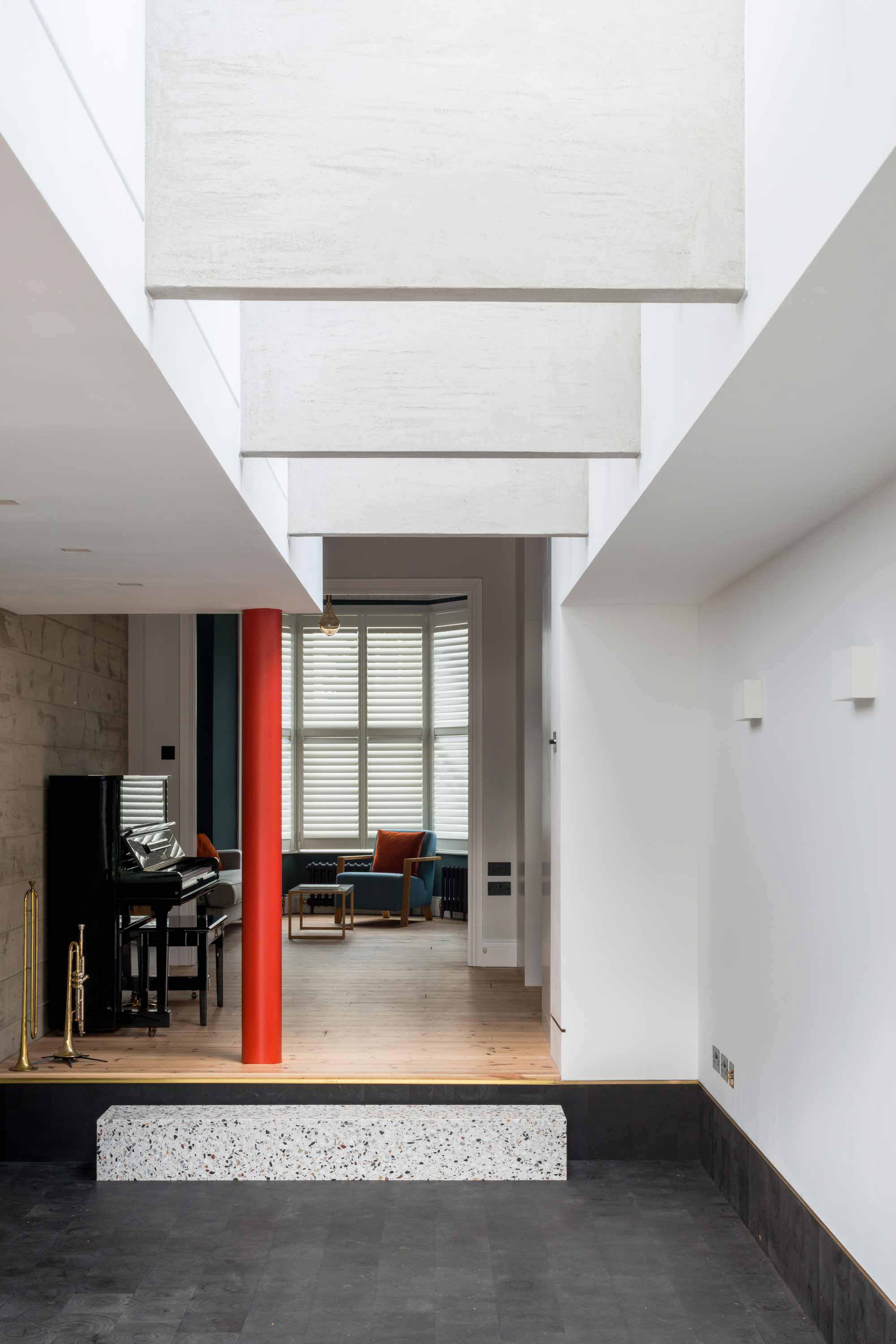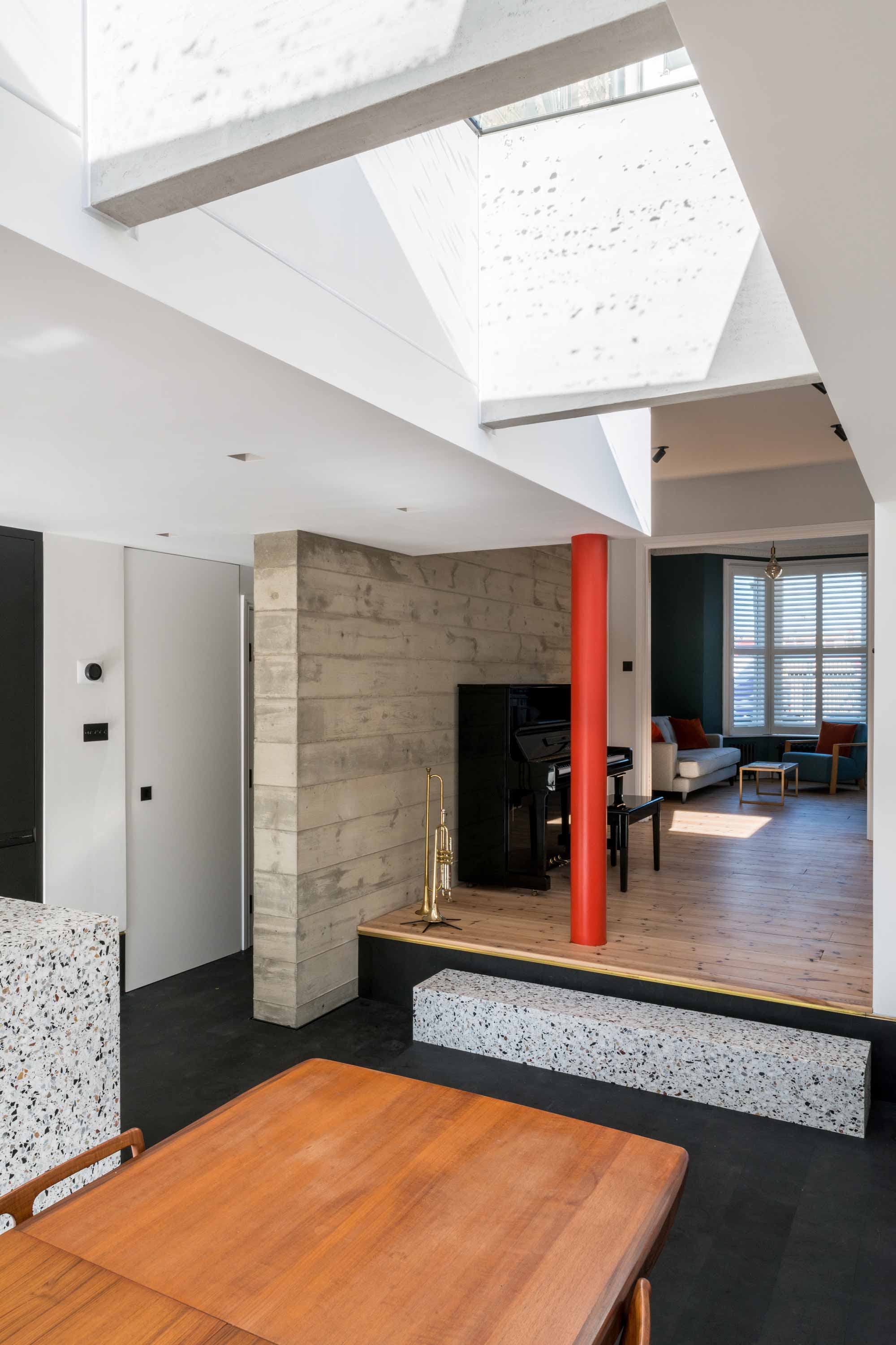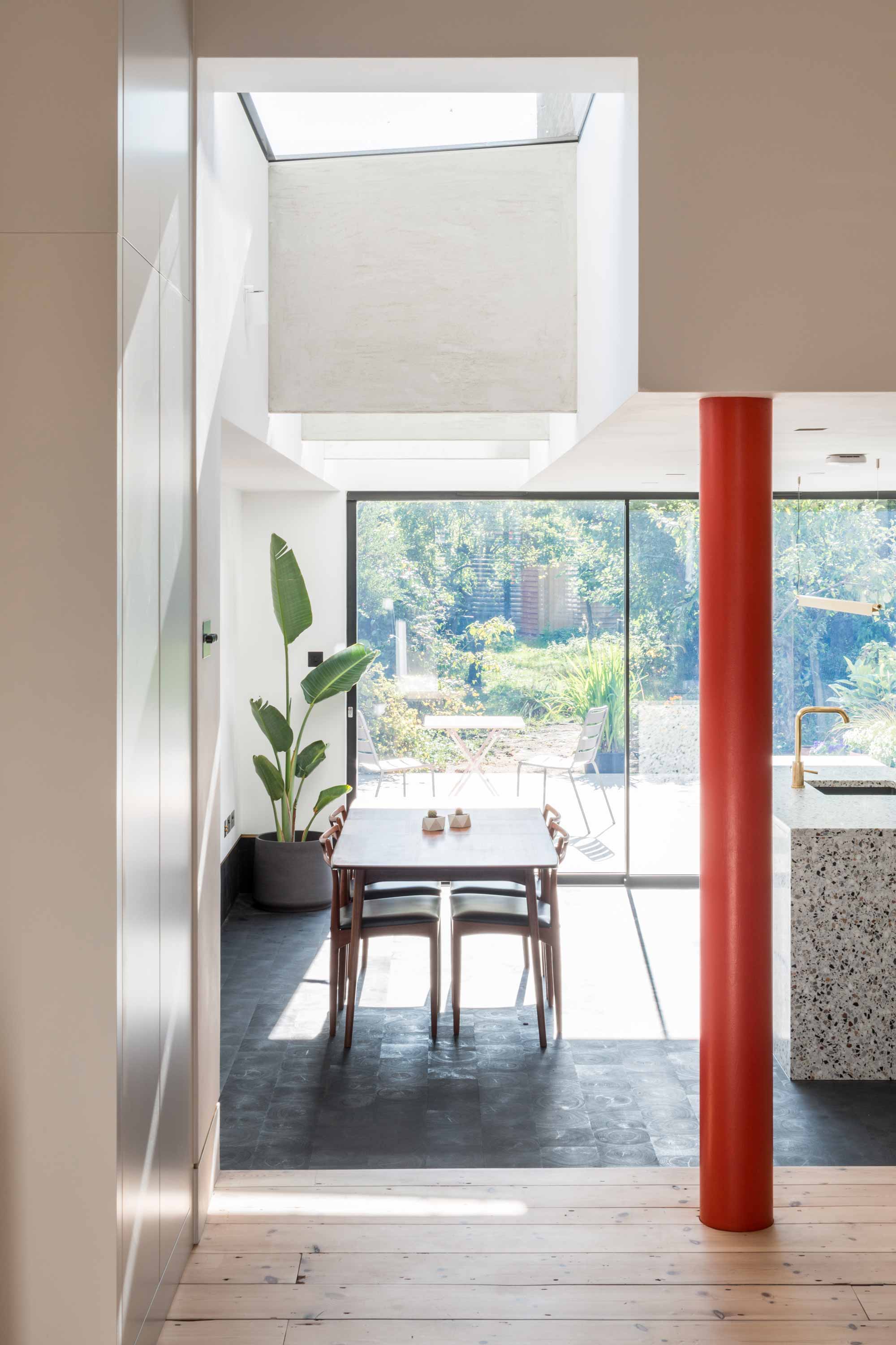 A new red steel column and cast in-situ concrete wall are the defining features of this extension and refurbishment project. A combination of full height and hidden doors create flexible space and have transformed the ground floor of this property into a single open-plan space, with room zones defined by floor level and material changes.