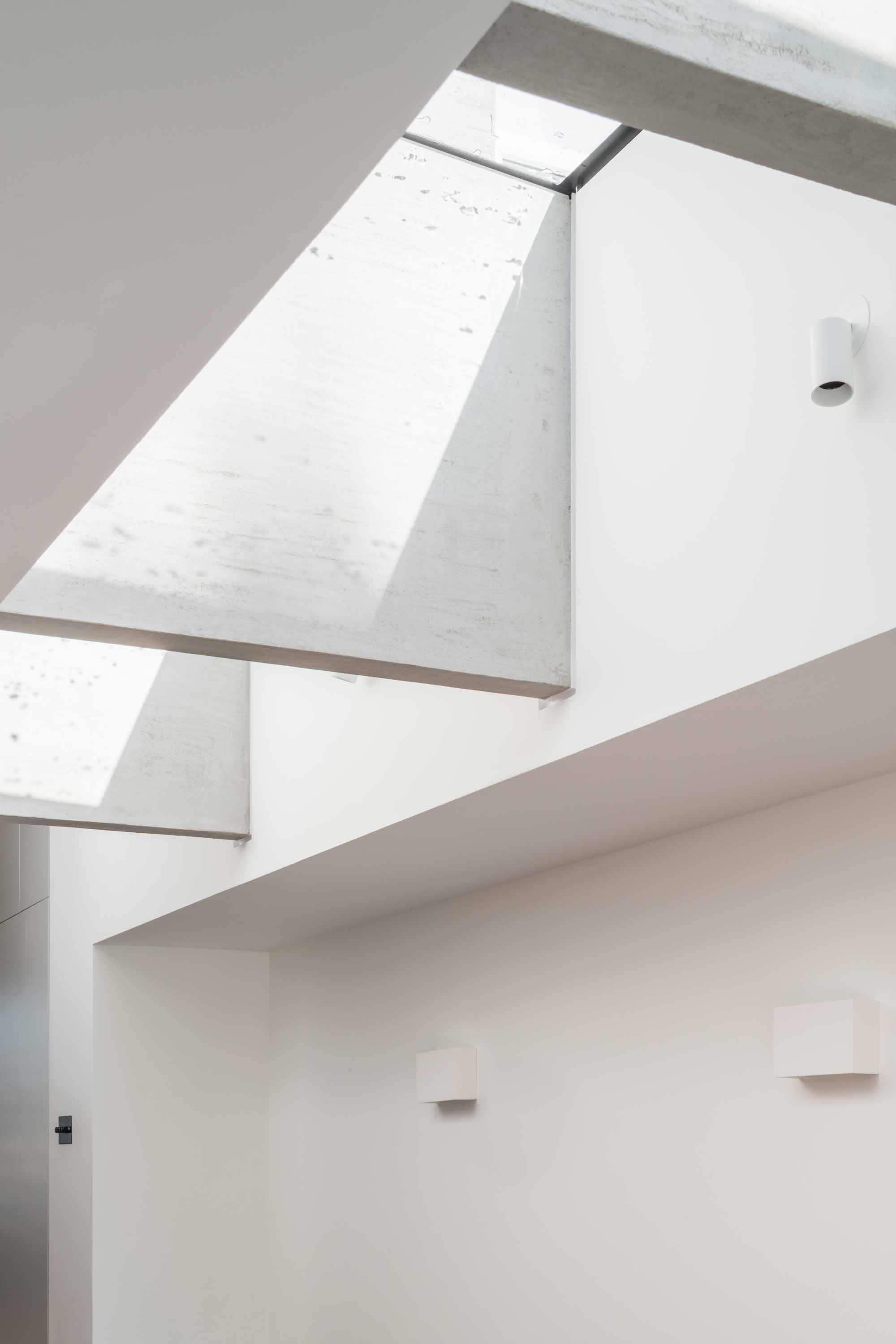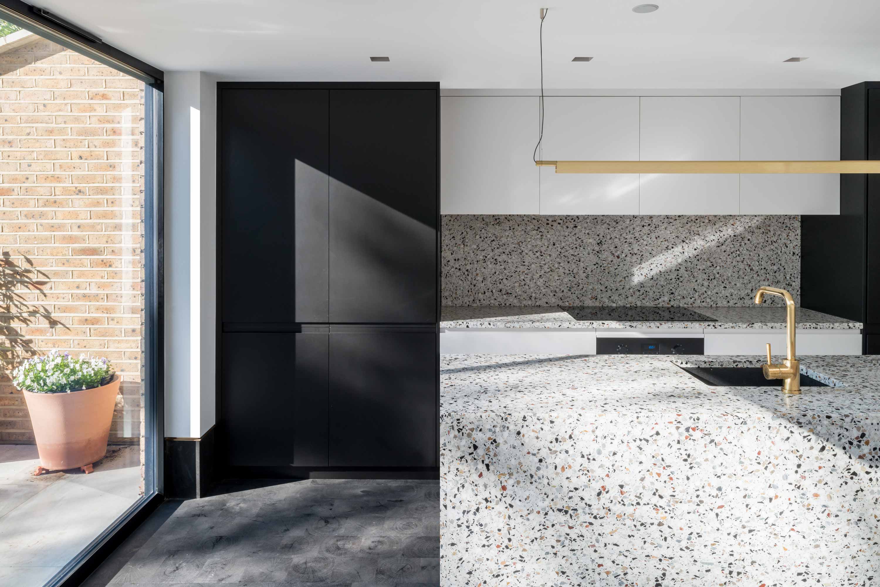 The dining and kitchen area is tiled with charred black wood flooring, chosen to produce a striking backdrop for the terrazzo kitchen and island, which is connected with a matching terrazzo floor. Concrete baffles below the new glass ceiling reflect and diffuse light.