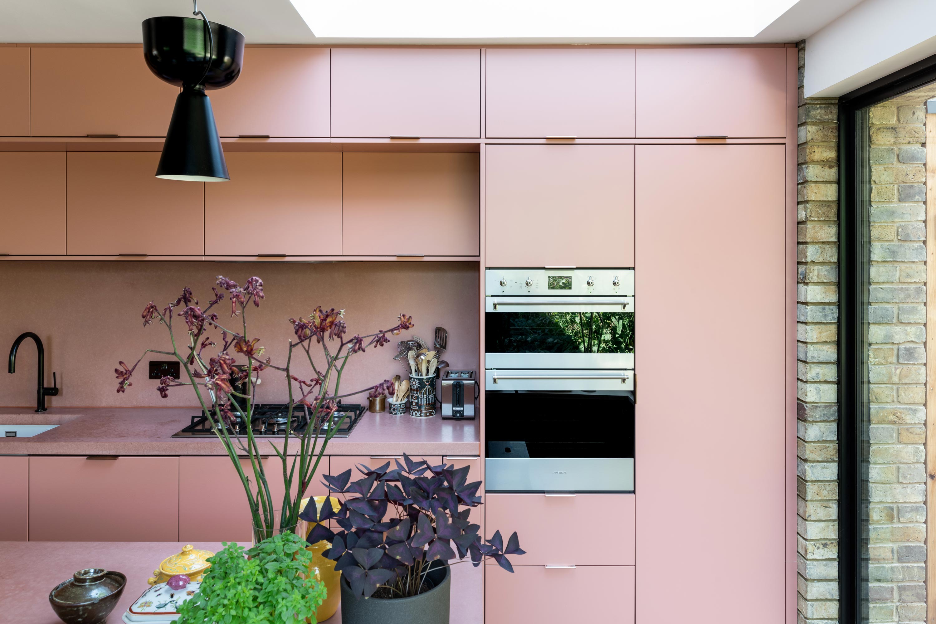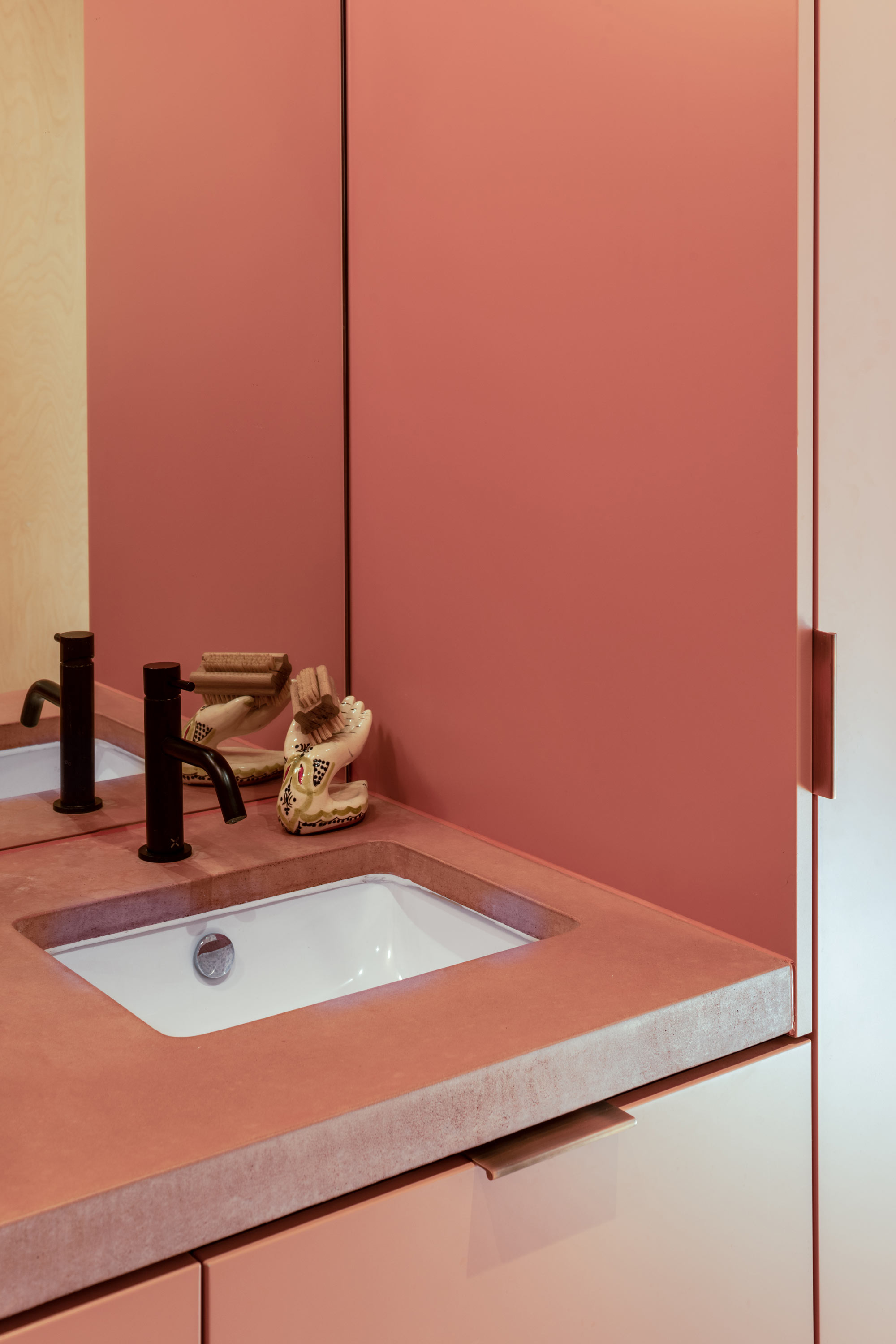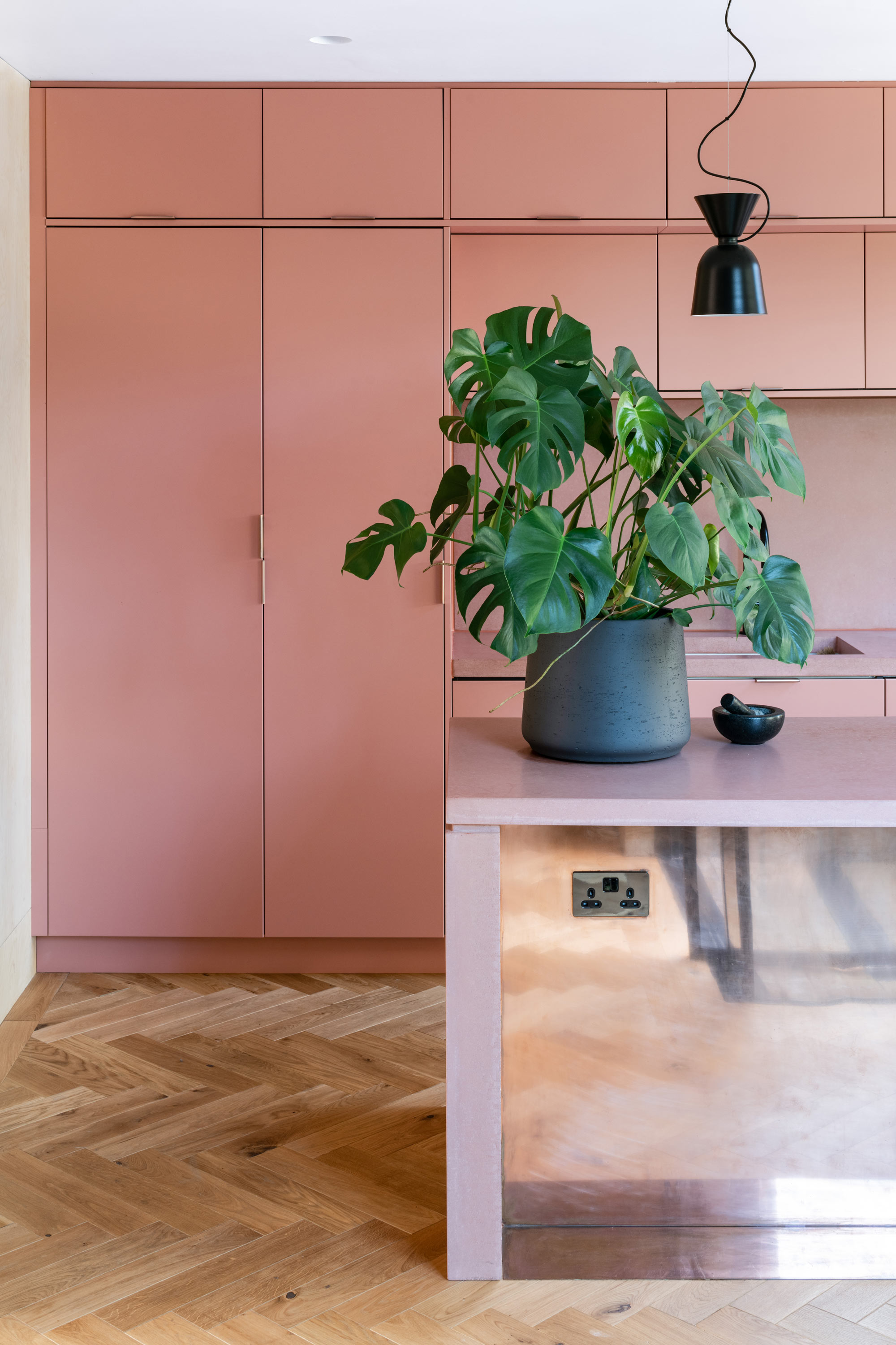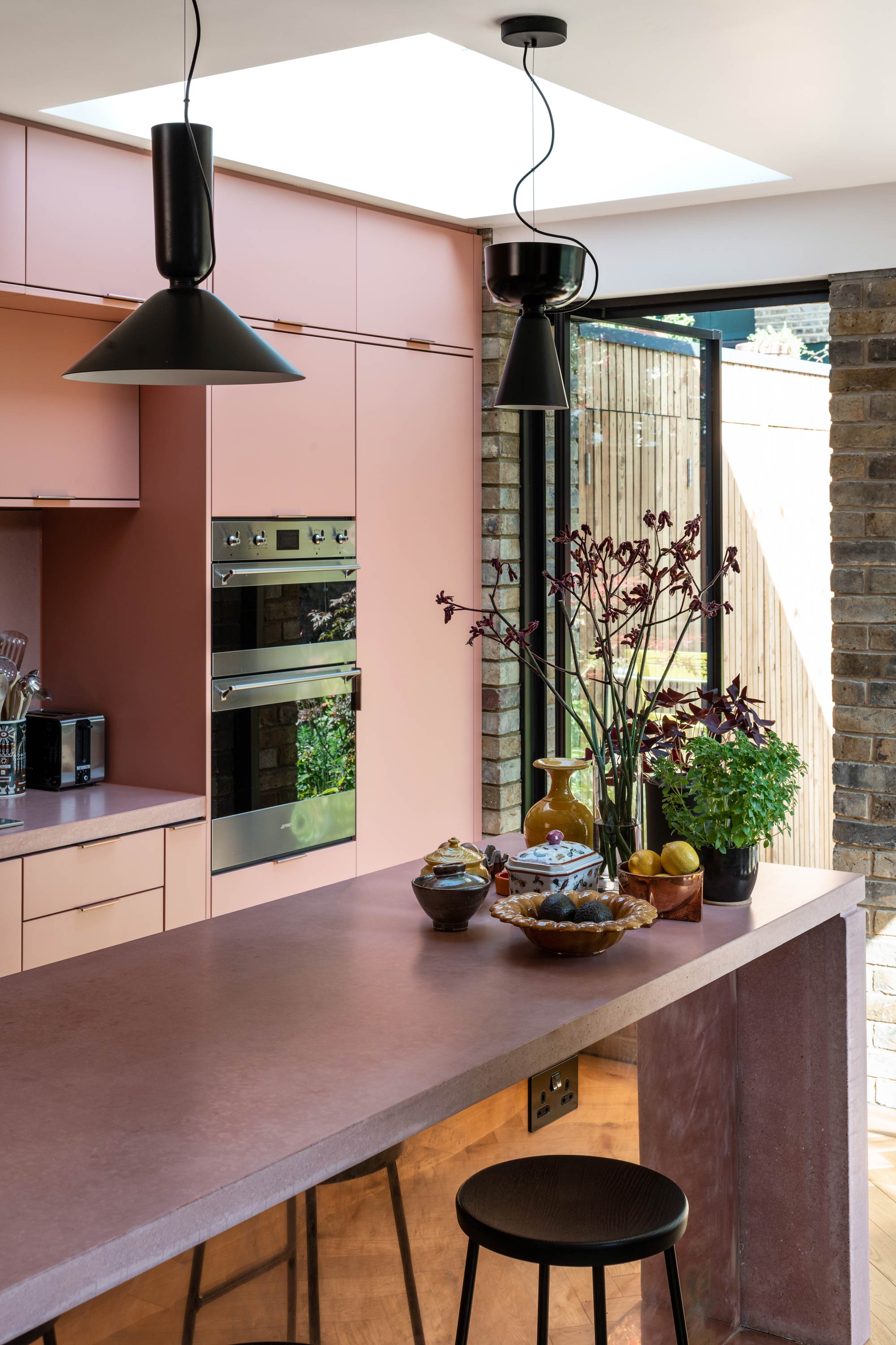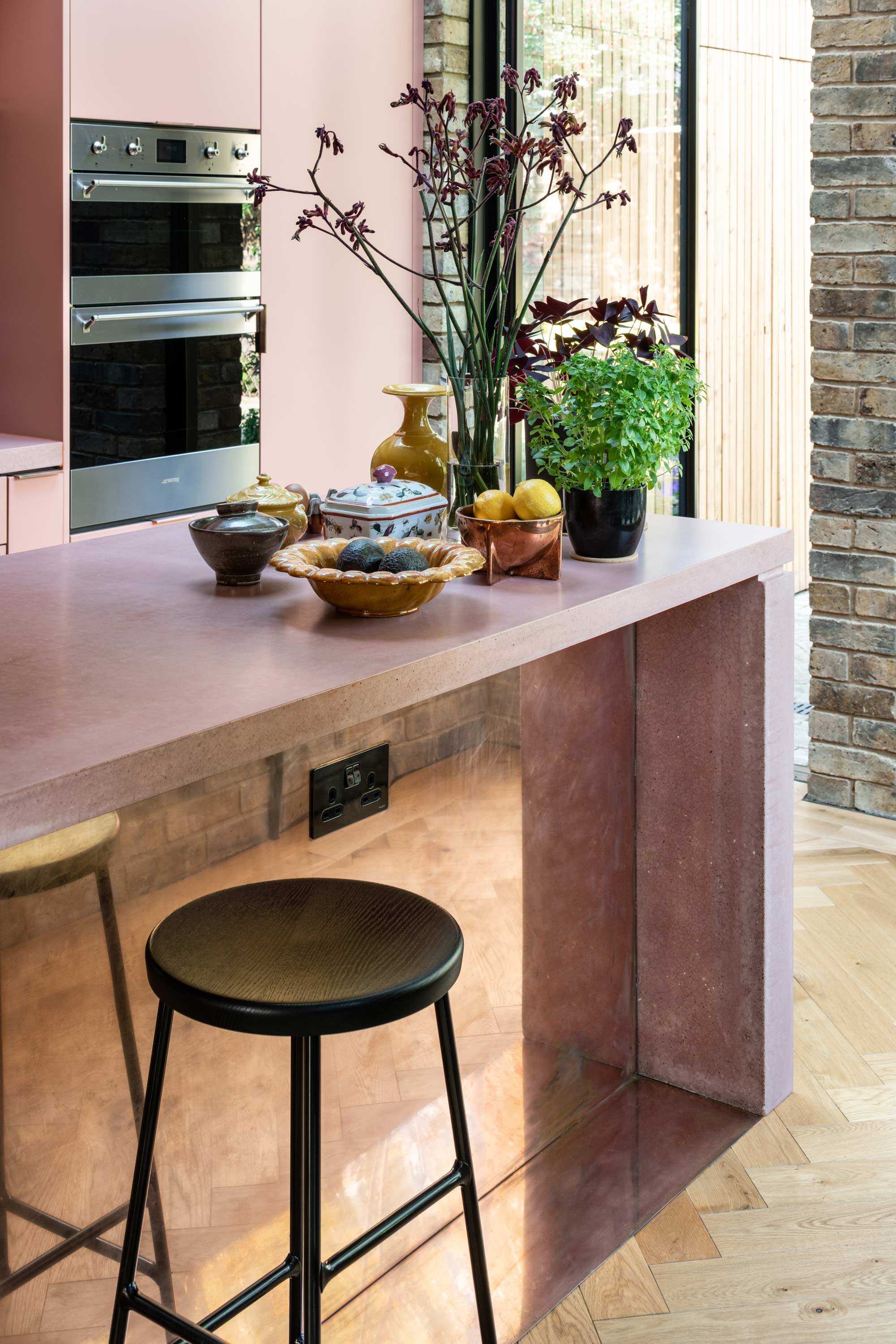 The pink colour for the kitchen came from the initial client briefing document, a favourite of our clients. We knew they wanted this soft warm ‘blush’ somewhere in the project from the get go. It became the distinctive colour for the hub of the house. The kitchen combines three different materials, all matched to one singular palette – the pink concrete, the pink joinery and the reflective copper, creating an enveloping, consistent and bold living space.