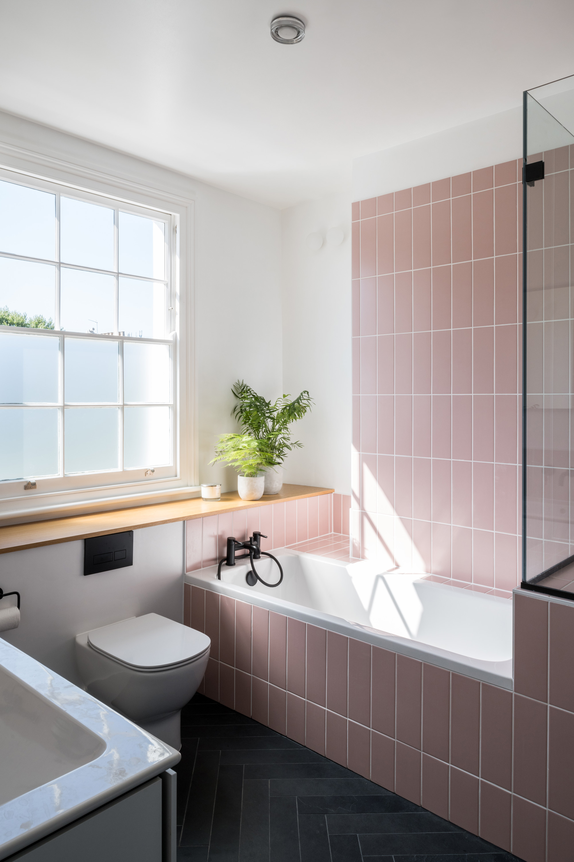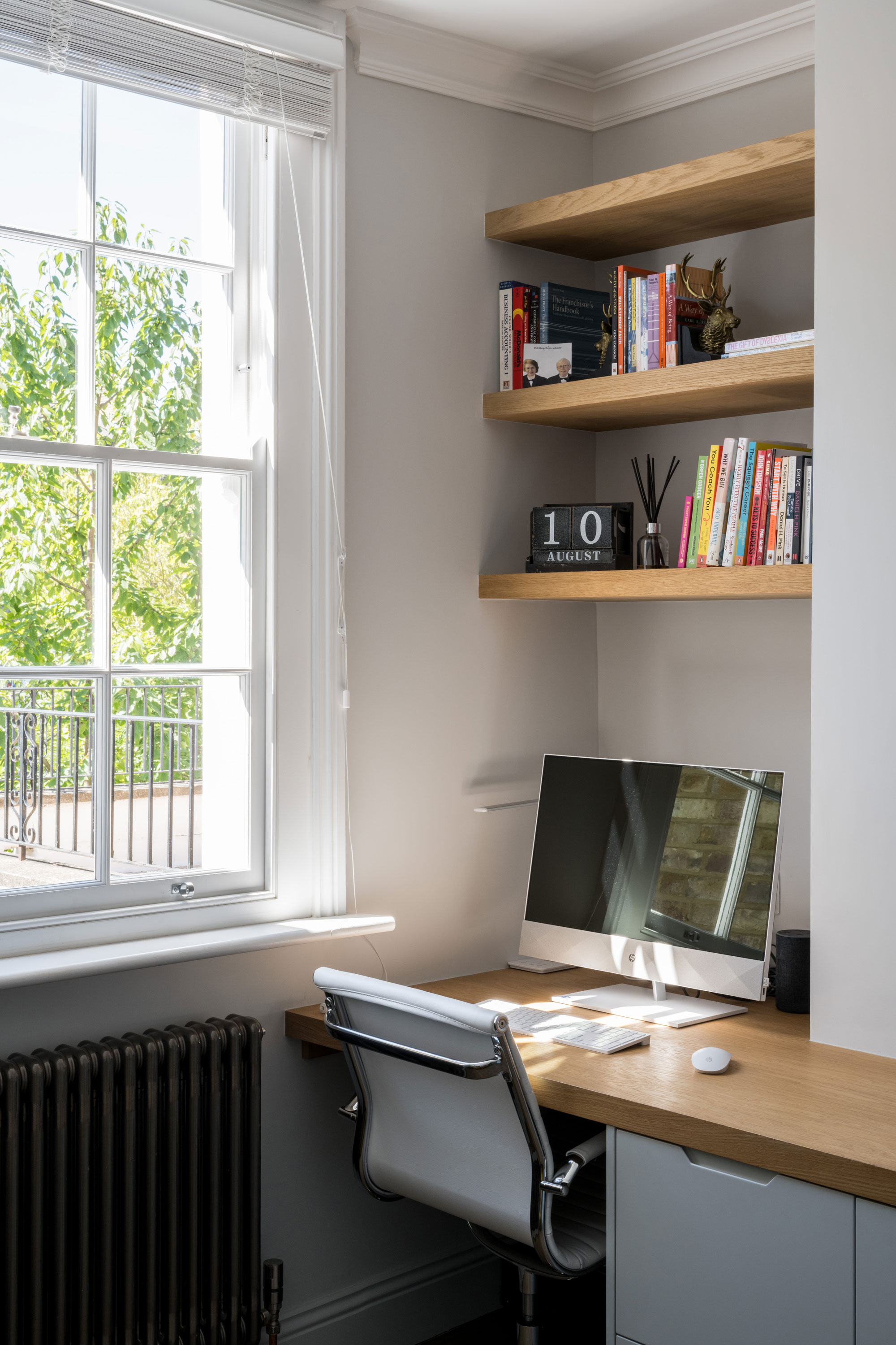 Upstairs, building levels were carefully coordinated to accommodate enough height for a new guest shower room above the kitchen. A rear room facing the garden has been transformed into the perfect study, with enough space for both clients to work in the same room.