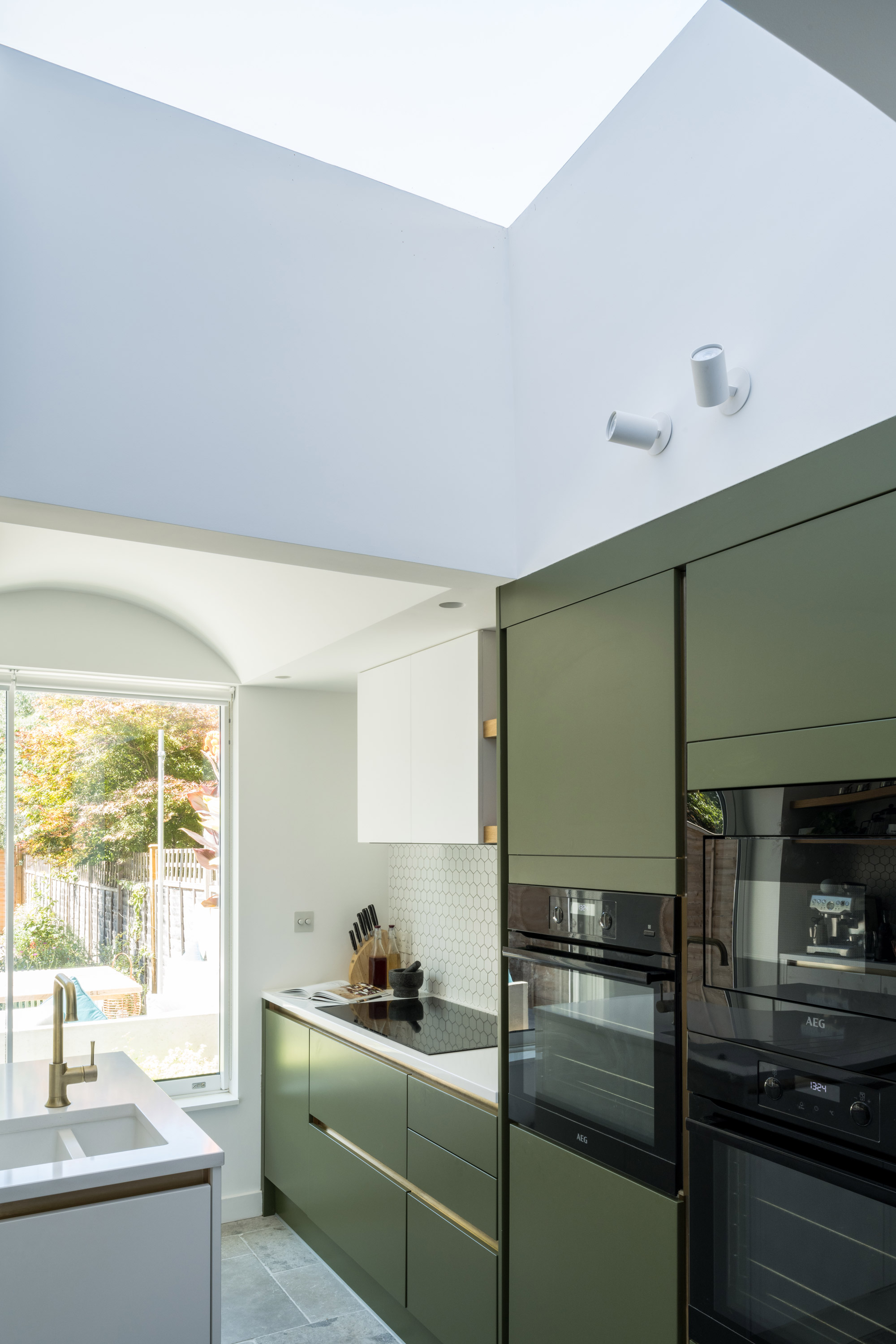 The kitchen is made to feel as spacious as possible with the addition of a new roof window and with a curved ceiling above the island. The space opens on the garden via a new glass door and a large sliding window. The sliding window opens onto an outside seating space that captures the best evening sunlight.
