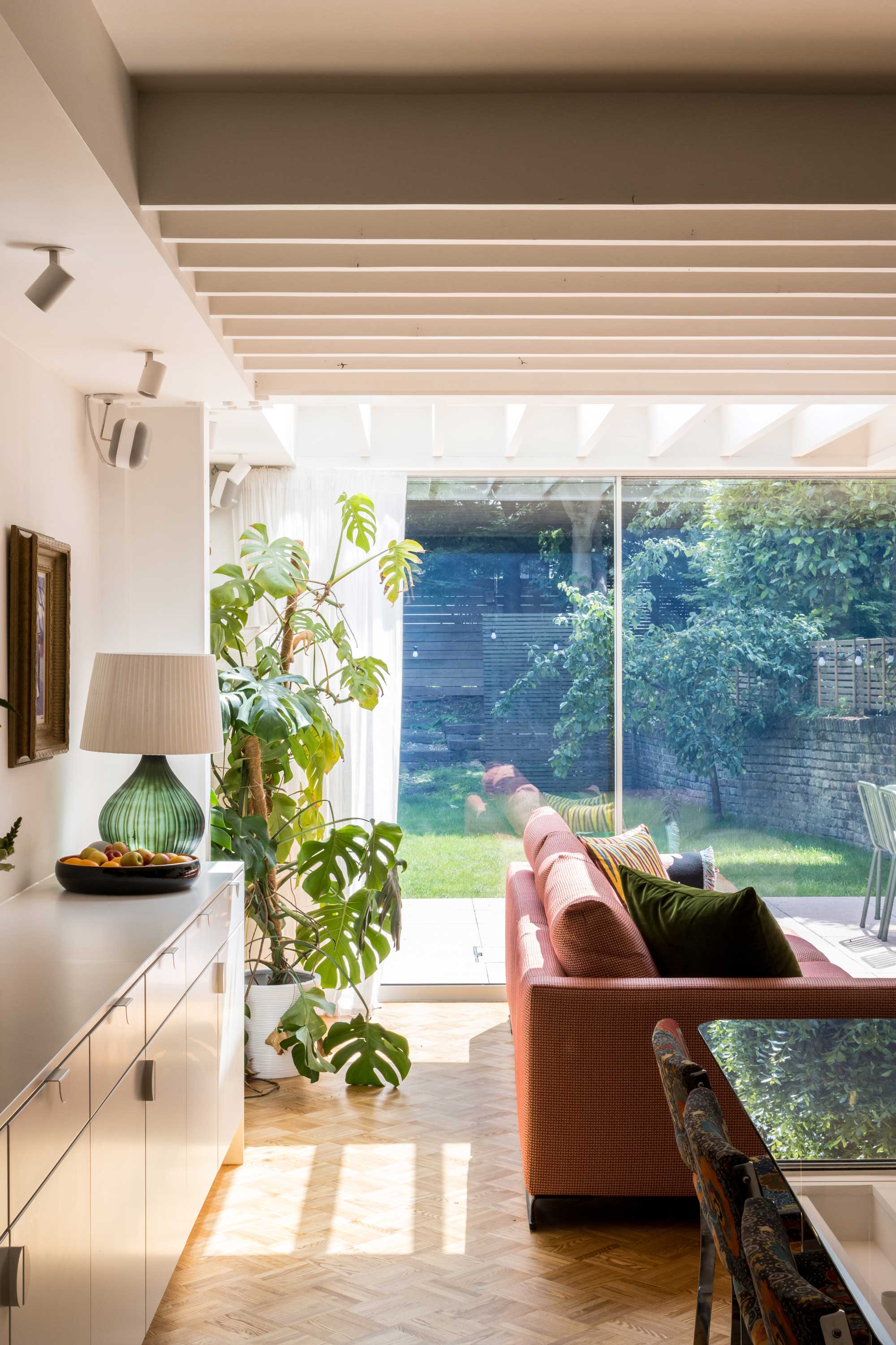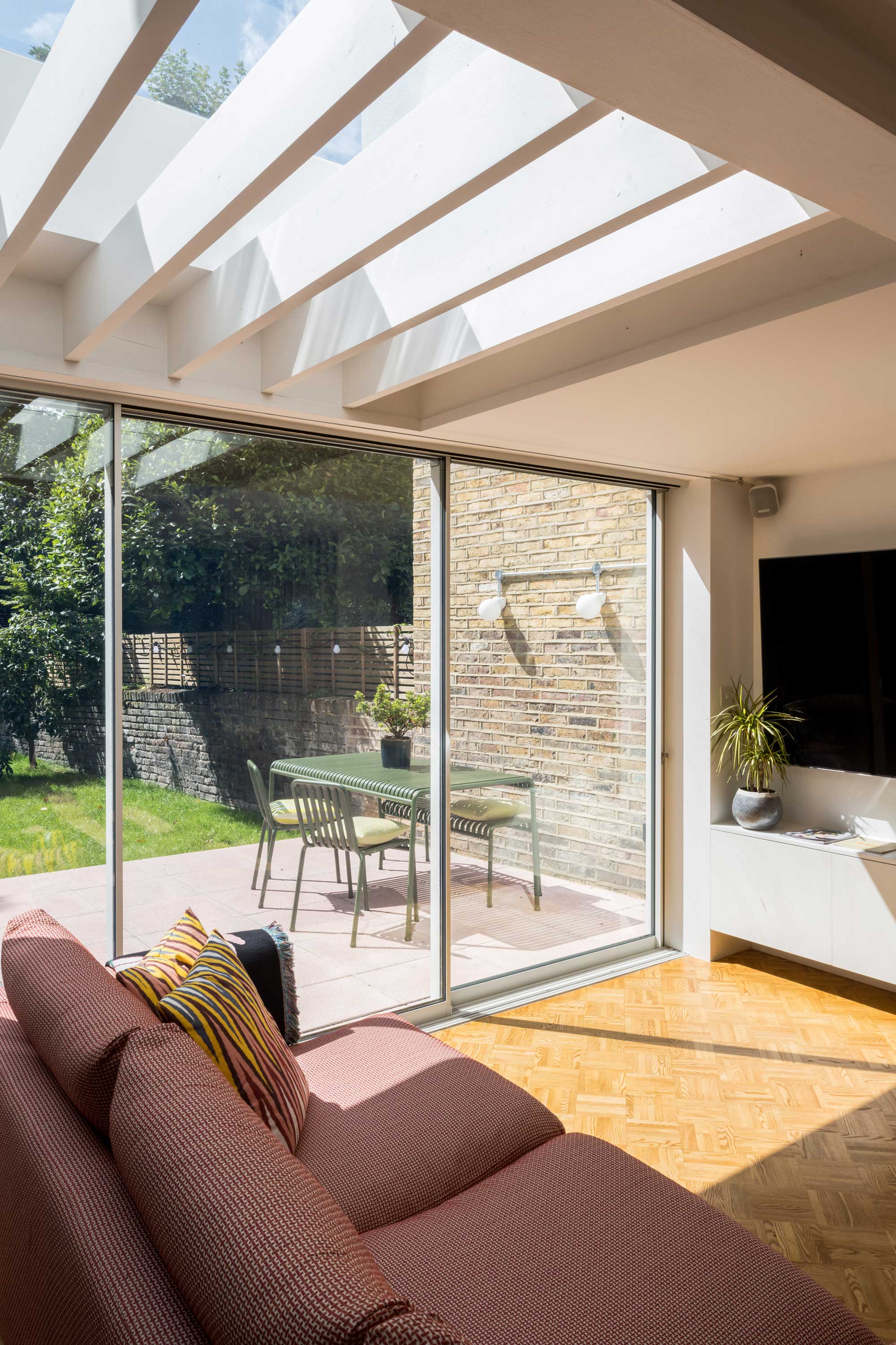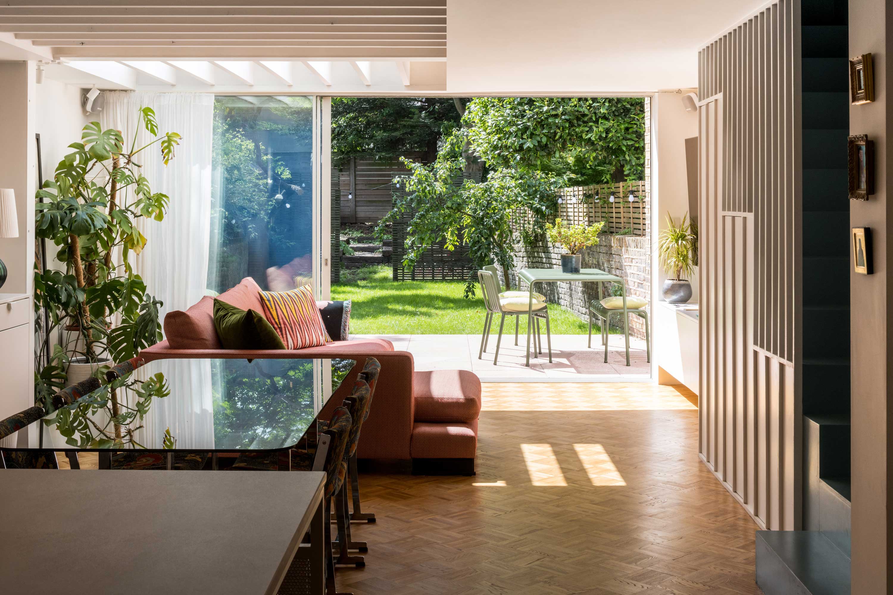The one key area we could address and manipulate natural light coming into the building was at the back of the house on the basement level. As this façade was also South facing, we knew we had to find a careful balance between creating light and view but also controlling overheating. We opened up the back of this space with new full width sliding doors with white metal frames. This area of the façade was quite well shaded by the tall trees at the back of the garden and being able to open them fully was a great opportunity for providing cross-ventilation to the open plan living space.