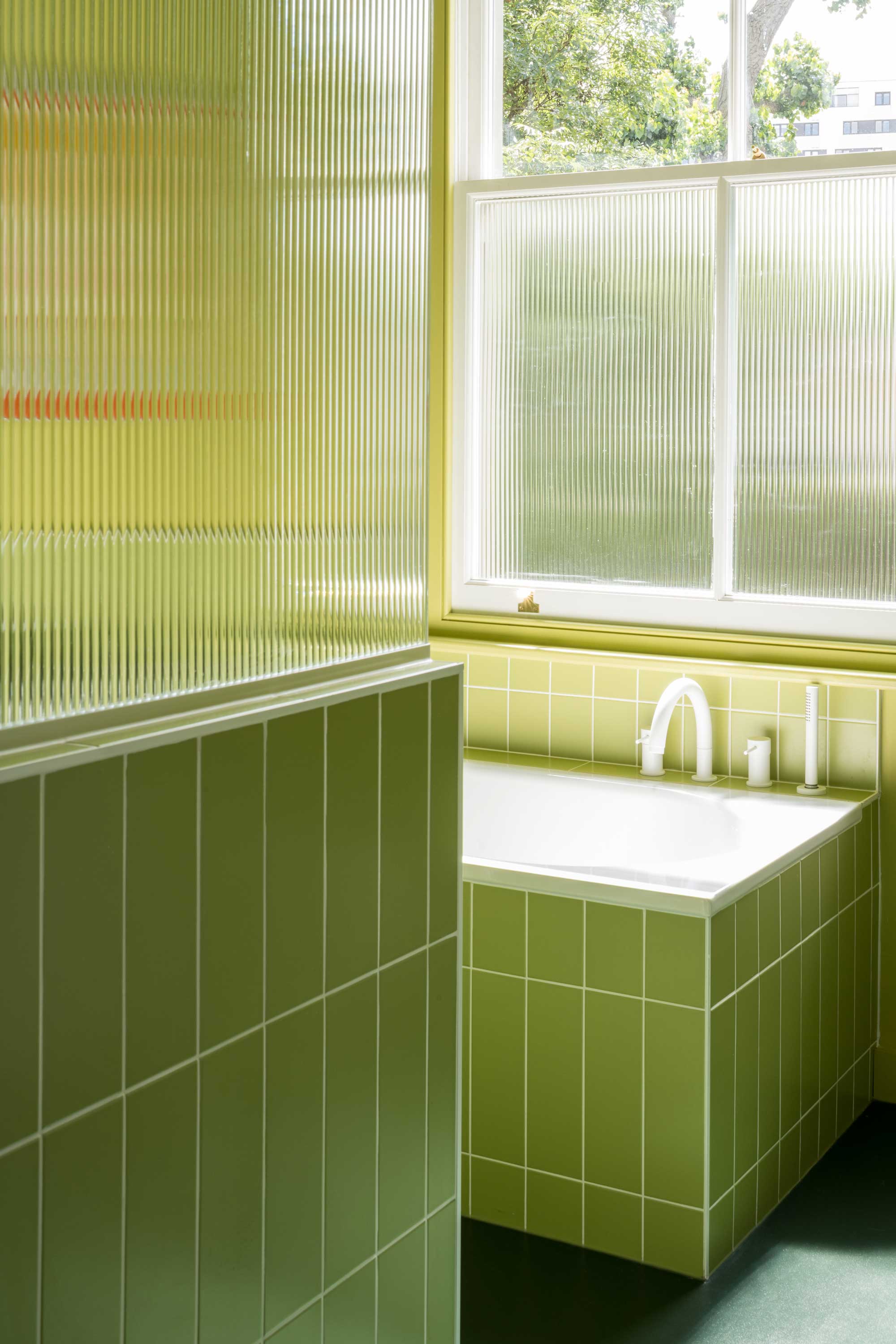 The existing stair was kept neutral, except for the citrine runner that spirals all the way to the top floor. On the way up, the master bedroom is kept moody and dark in an all-encompassing downpipe grey, relieved by a soft rusty orange carpet. The master walk in wardrobe continues the moody darkness, this time in a deep green, preparing for the pop of ‘euphorbia’ green that is the South facing master bathroom.