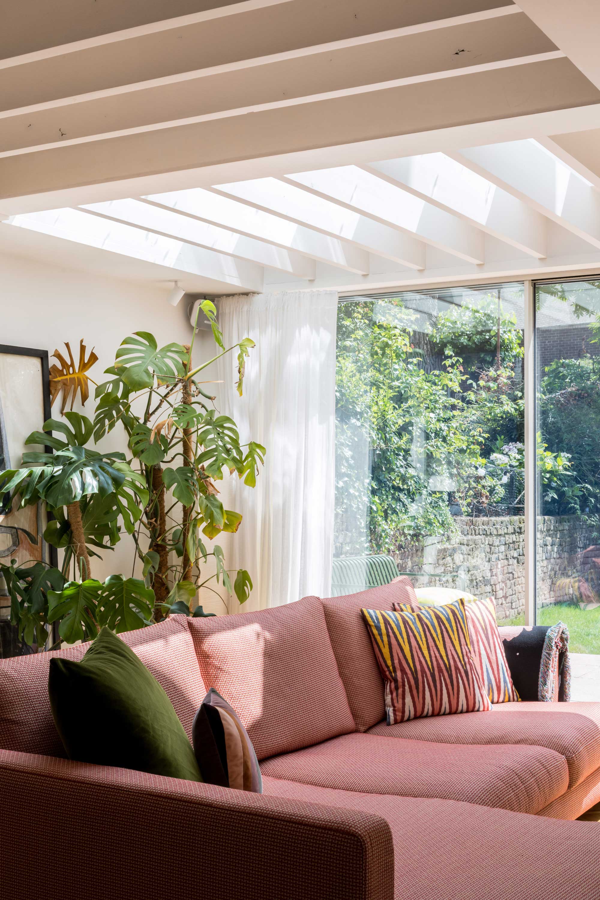 The flat roof area of the new extension, which was relatively small (approx. 3×2 metres) was a great opportunity to bring in natural light from a different direction but equally this area was less shaded. Our solution was to place a large glass rooflight with high sides internally to minimise direct light coming into the space. We also designed the roof to be supported by slender timber joists, which we left exposed under the roof window. We oriented these perpendicular to the garden so that they would allow view of the sky from inside but also provide further shading and surfaces for the daylight to reflect off.