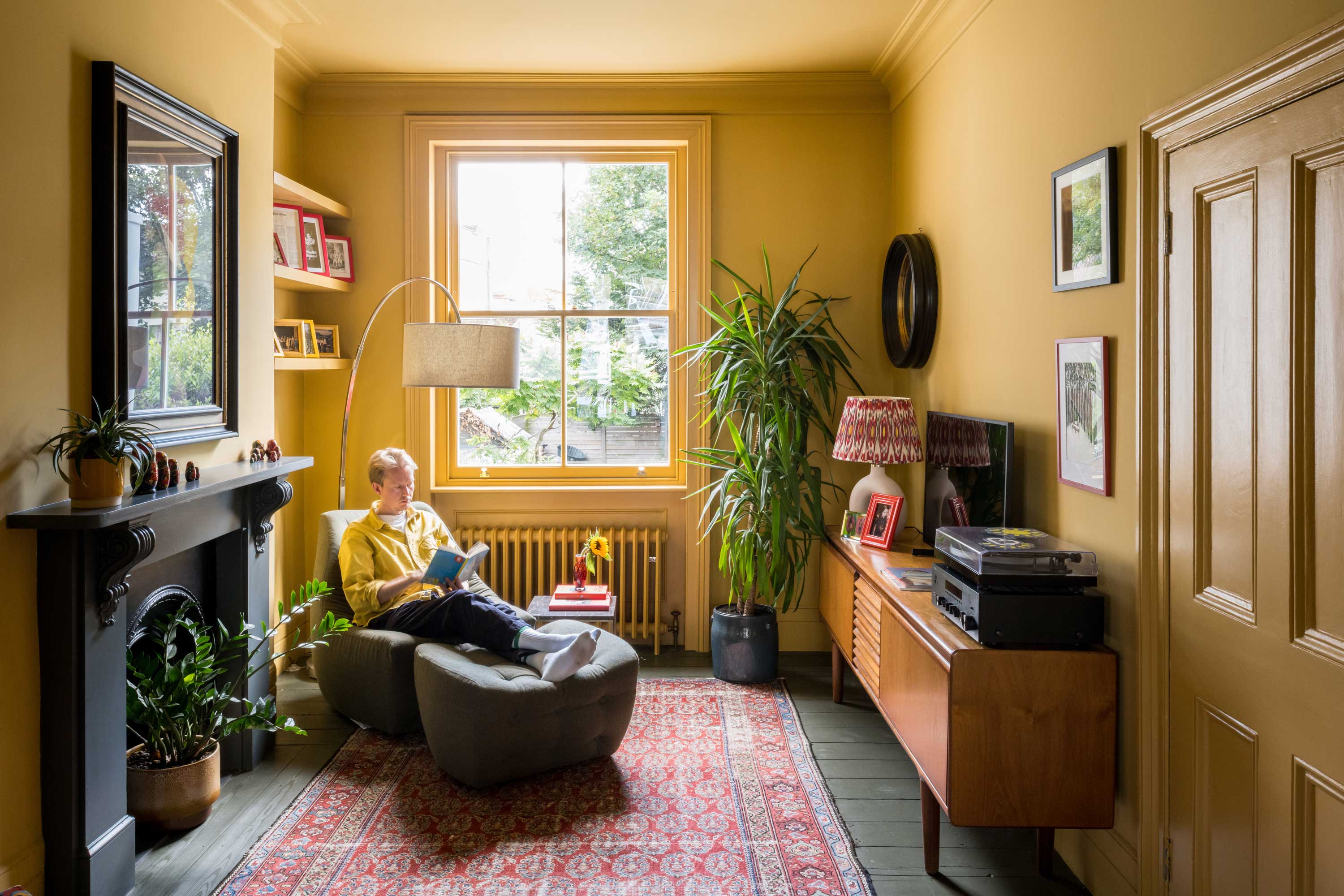 The ground floor got accents of bright emperor yellow that are softened by the more neutral French grey front room and deep green floors. The yellows of the bathroom and rear reception are positioned on the South side of the house to make the most of the daylight and brightness, meaning you are always looking at the back of the house via a sunny frame.