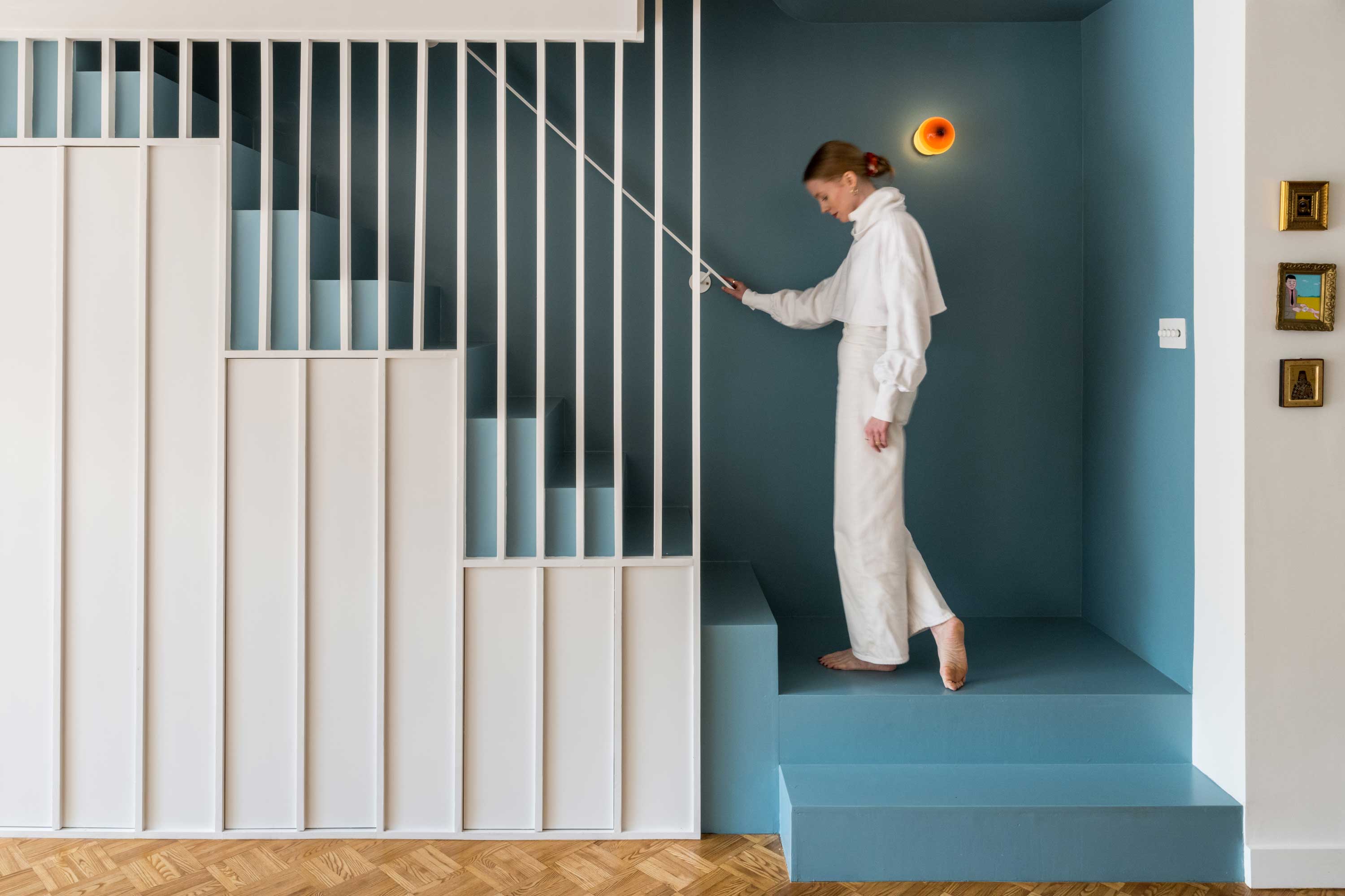 The lower ground floor was kept bright, white, and textured. It pursued a clean LA vibe with an almost technical feel, assisted by the white lighting, appliances and painted, exposed structural steels and timber. The white backdrop was contrasted by the rich patterned Ash parquet, the stone blue ‘wormhole’ stair that slides into the middle of the room and the deep burgundy kitchen.